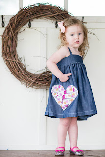 February is around the corner, and my holiday crafting heart was craving a sweet accessory to my daughter's new simple Hattie's Dress pictured above. I've had this vintage candy heart stamps fabric for a while, and knew it would be a fun touch. Hattie's is one of my all-time favorite CKC Patterns, and what could be better than Hattie's with a pocket? Let's make it a heart pocket!
