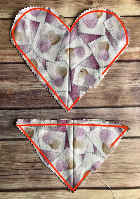 Place your heart pieces right sides together and pin in place. Starting about 1" from the bottom point, sew all the way around your heart leaving a 2" opening to turn the heart when you're done. Make sure you backstitch at the beginning and end. Repeat with the triangle pieces. Use pinking shears or scissors to clip the curves and tips of the heart and triangle pieces.