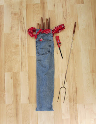 All you need is an old pair of men's jeans, two red bandannas (or 1/2 yard fabric), and a denim needle for your sewing machine! If you don't already have some, you will probably want to buy some roasting sticks too -- I bought these at Walmart for Father's Day forever ago. And because they are kept safe and sound in the awesome bag, they have lasted a loooong time.