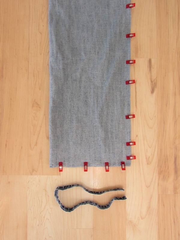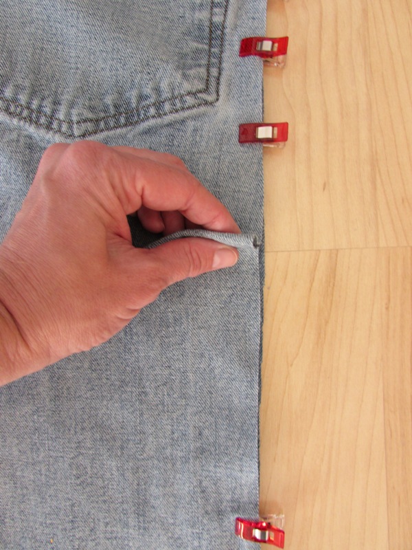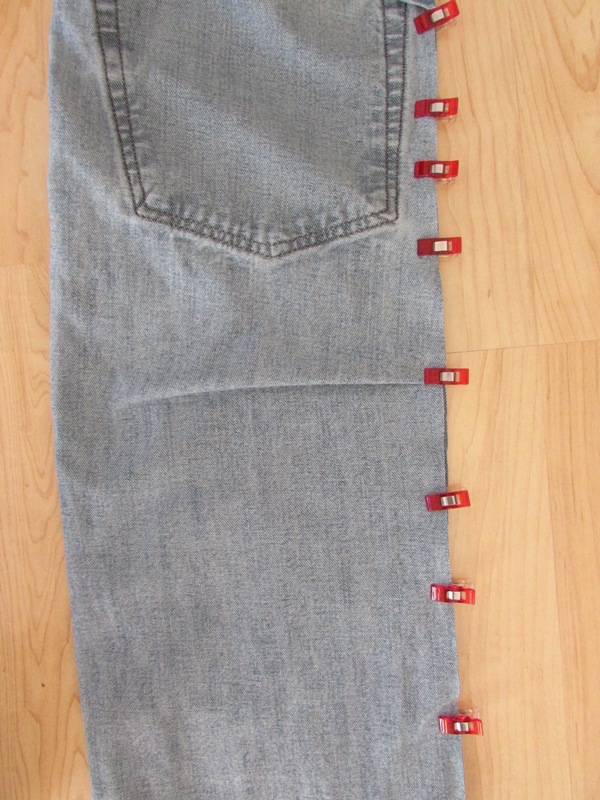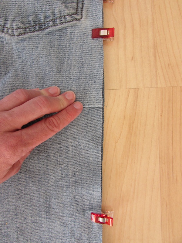 Now you're ready to sew! You MUST use a denim or leather needle to sew through the denim layers. Beginning with the bottom of the leg, sew the pinned/clipped edges using a 3/8" seam allowance. After sewing the bottom edge, sew up the side pinned edge, again starting at the bottom because the layers aren't as thick there.