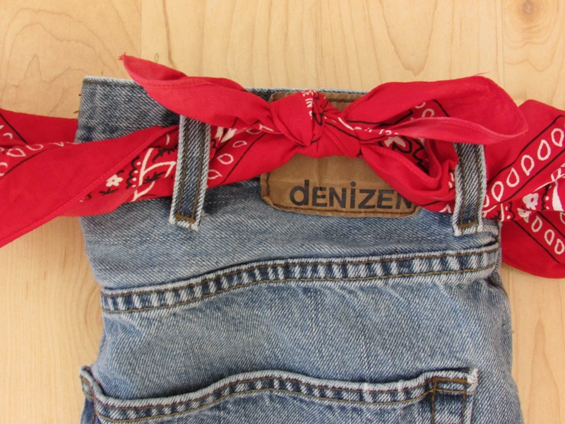 Roll up each of the bandannas so they are thin enough to feed through the belt loops. Bring the two loose ends together and tie another square knot. Make sure it doesn't slip.