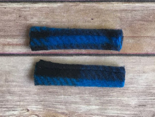 Step 6: We will now pin these to the right side of one of the backpack pieces .5" from the bottom raw edge. Because fleece is so thick, I prefer to place one raw edge of the loop above the other one as shown here. Sew these in place. **If you are using woven fabric, I preferred to place the raw edges of the loop on top of one another instead of separated, but either way is fine.