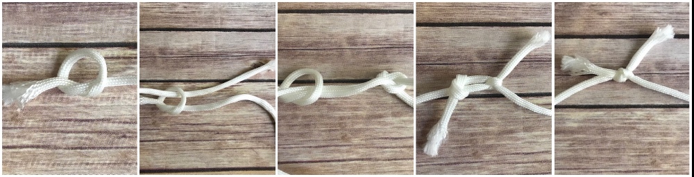 This is how I did it, but you can use any method you may be familiar with. First, I started by making a loose knot with one end. Second, I passed the other side of the cord through the center of that knot. I then tied a knot around the other cord as shown in the third picture. Then I scooted the knots closer together and then pulled them tightly together as shown in the last two pictures.