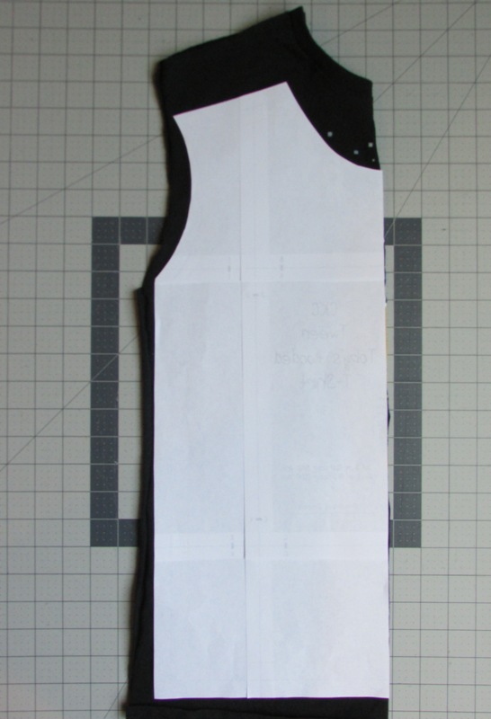 Lay the printed pattern piece on the shirt, paying attention to where the picture and the seams fall. Because this pattern is on the fold, it needs to fit on the shirt twice. It looks like we're safe to use this size!