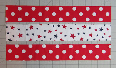 Take the top two strips and match them with right sides together, lining up the bottom of the red strip with the top of the white strip. Sew them together along that edge using a 3/8" seam allowance.