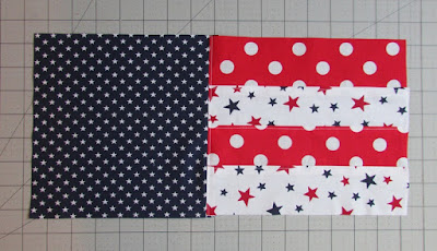 Take the smaller blue square and match it up with the left side of your sewn strips, with right sides together. Check to make sure you still have a red strip at the top and a white strip at the bottom! Sew the pieces together along the side edge, as shown in red above.