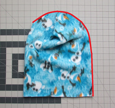 Fold each end in toward the center to where they meet in the middle, with right sides together. Two of the points should match the other two points at the top. See photo above. Pin the two outer curves together. Sew the pinned edges in place, as indicated in red above, using a 1/4" seam allowance for the slouchy hat or 1/2" seam allowance for a more fitted hat.