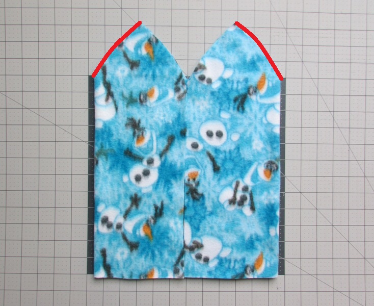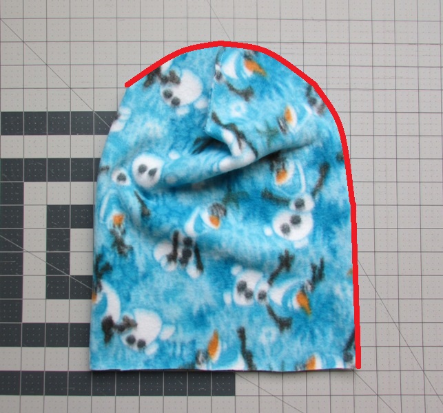 Fold the hat again so the remaining curves match up at the top. Pin in place and then sew as indicated in red, again using a 1/4" or 1/2" seam allowance.