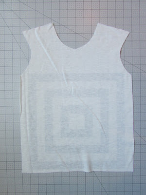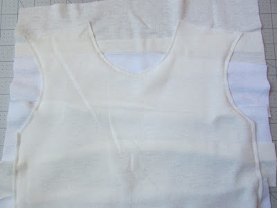 Carefully lift the piece and take it to your sewing machine. With the shirt piece on top as shown above, sew around the piece 1/4" from the edge, securing the strips to the shirt piece. Do not sew the bottom strip in place; it can be left dangling. So you only need to sew the sides, armholes, shoulders, and neckholes. See photo above.