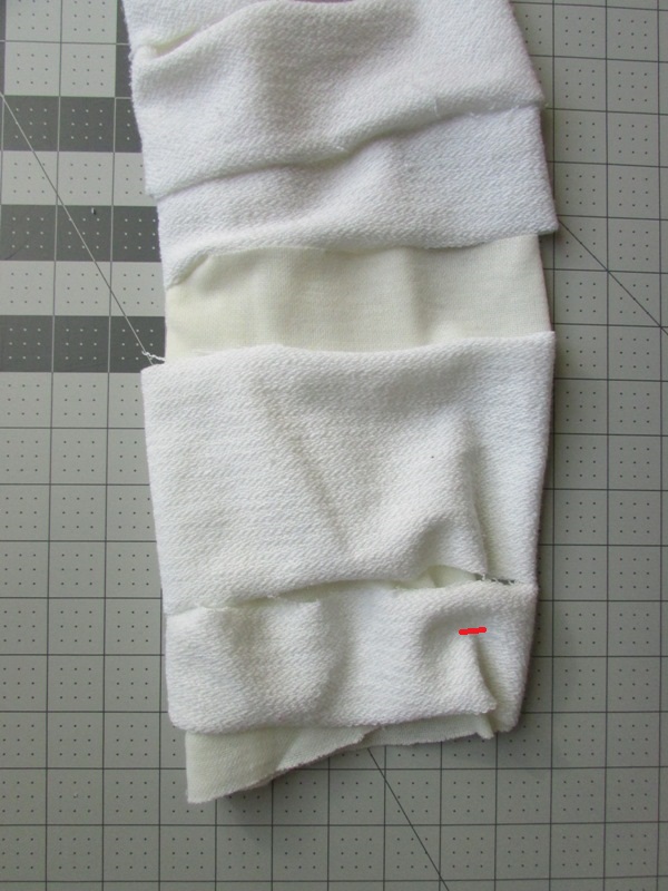 When it comes time to turn the sleeves right side out, you may find that some of the loops are on the wrong side of the sleeve, as shown above on the left side. This isn't a problem at all! Simply grab the loops that are on the wrong side and flip the sleeve through them so they're on the correct side. Start with the highest ones first. It's super easy to do; I'm just telling you so you don't panic when you find them like that.
