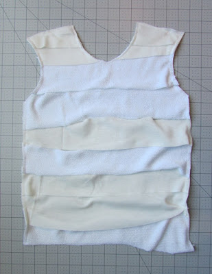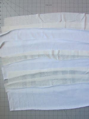 Take the shirt piece off and then keeping its size in mind, lay out some of the strips *face down* on the flat surface. Begin with one strip at the top, face down, and then overlap a second strip below it, again facedown. Continue layering until you have them covering the space that the shirt piece was taking up. If you are using more than one fabric like I did, alternate the colors randomly. Notice that I did 2 then 2 then 1 then 1 then 2 then 1. It wasn't any set pattern -- I made it look random on purpose.