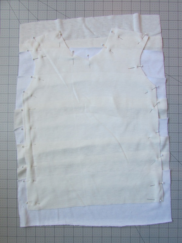 When you have enough strips set out, place your front shirt piece on them with its right side facing down, toward the strips. Pin the layers together all around the shirt piece, as shown above. Be sure to use at least one pin at each overlap, and even more is better. When you pick it up, you're going to wish you had even more pins! The strips are going to move a lot.