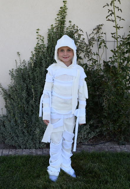 My kiddo wanted to be a mummy this year, and while part of me thought, "Hey great, I'll just show up at the school with a big roll of gauze when it's time for the parade", I also realized how much better it would be for my son and his teacher (any myself, to be honest), if his costume was all self-contained and easy to put on and off all by himself! Really, there's no comparison when you think about it that way.