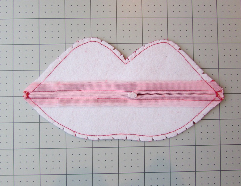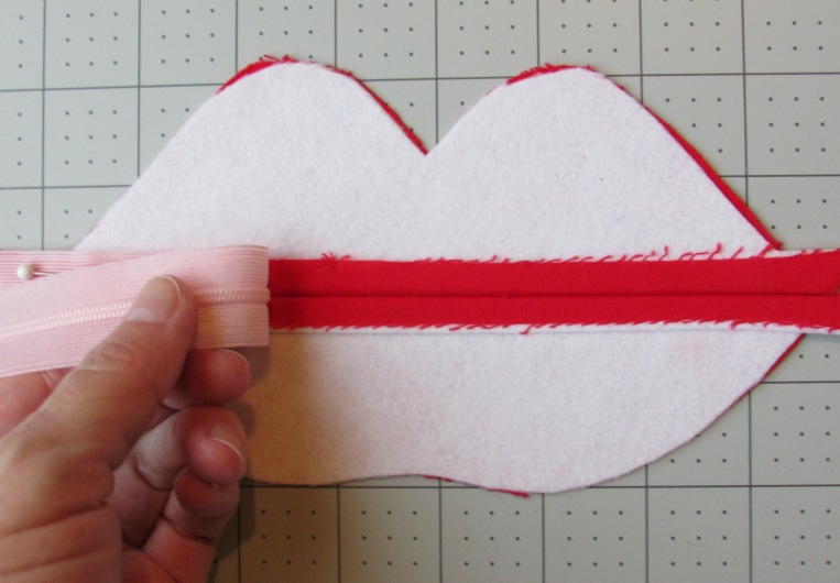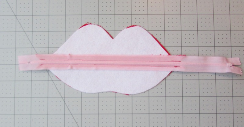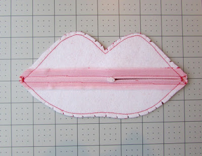 Sew around the lips using a 1/2" seam allowance. This will work best if you start on one side and sew across the top curves, pivoting at the center point, and end at the other side. Then start again on the side and sew around the bottom curves, ending on the other side. This will give the zipper a little more stability. Note that if you have a wide or metal zipper, you may need to help skip your needle over the teeth of the zipper! To do this, slightly lift the presser foot, slide the fabric where it needs to go, and then lower the presser foot again and proceed to sew on the other side. If you're not sure where the zipper is in relation to your needle, it is safest to check by hand-cranking your machine slowly; that way you can stop it and readjust before going in. You don't want to break your needle! (Note: No needles were harmed in the making of this project. It's really not scary at all if you're careful.)