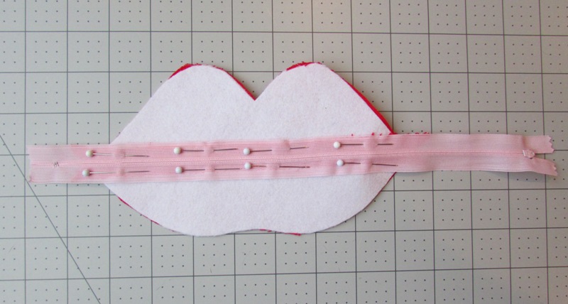 With the wrong side of the lips and the zipper facing up, begin pinning the zipper to the back of the lips. You want the center of the zipper to go right down the center seam of the lips. Place a pin on both sides of the zipper so it can't slide out of place. The end of the zipper should reach well past the lips. After placing the top two pins, your project should look like the photo above.